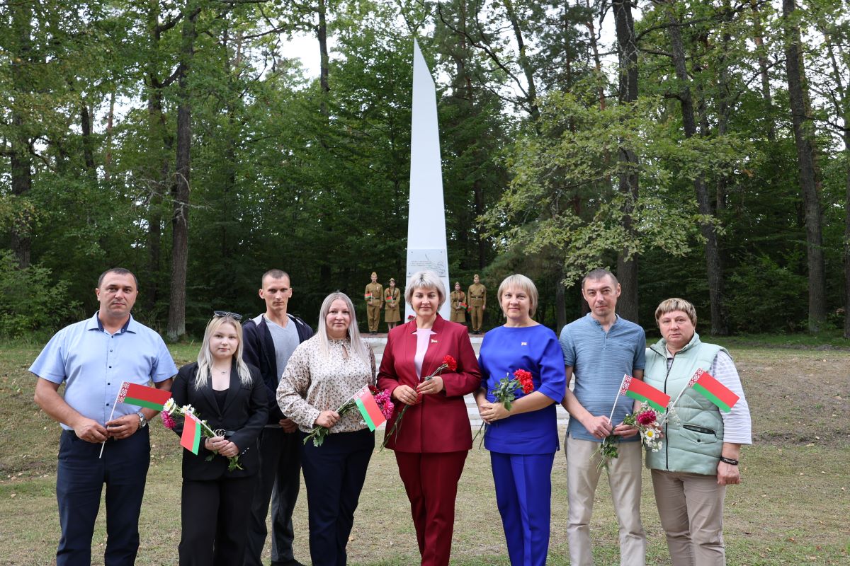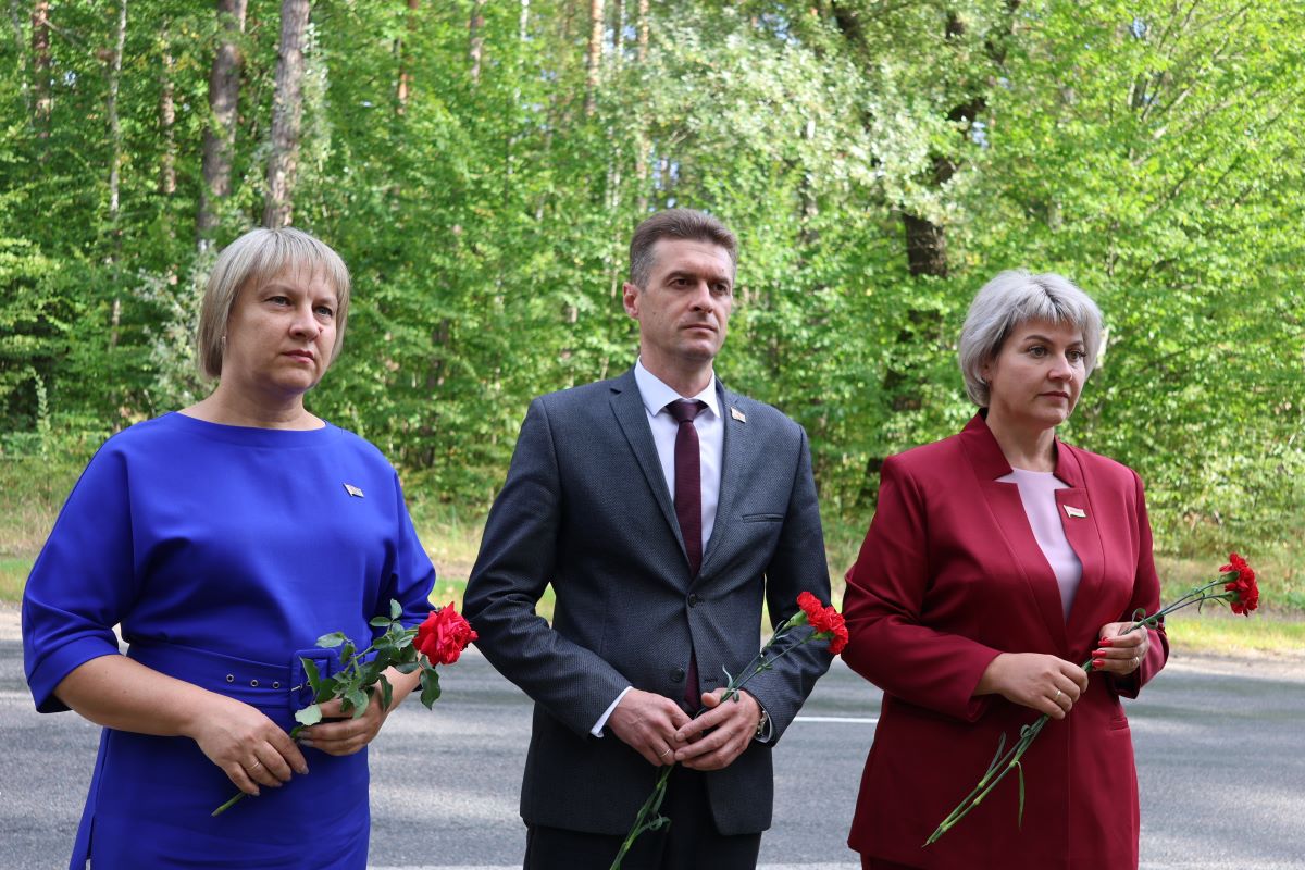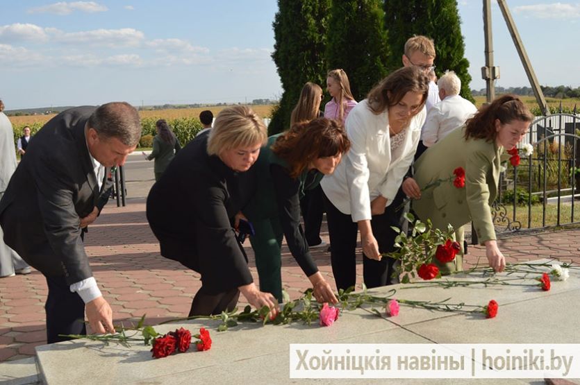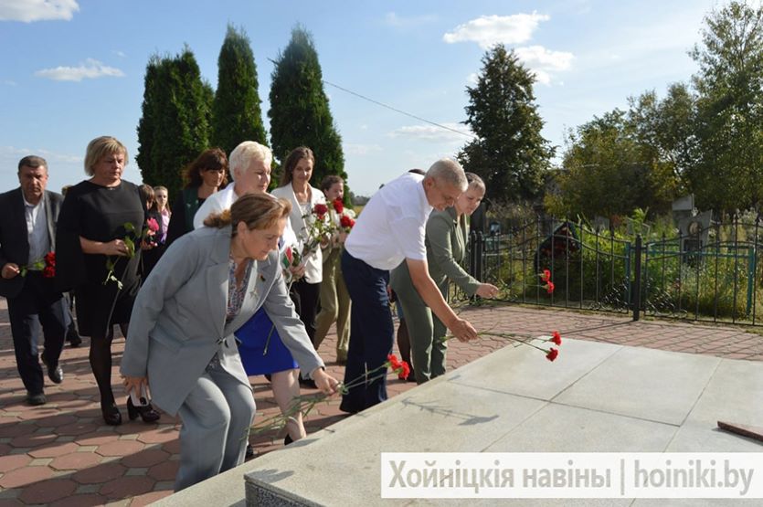 Живые цветы к Братской могиле принесли во главе с первым заместителем председателя райисполкома Александром Максимовичем лидеры районных организаций общественных объединений «Белая Русь», БСЖ, БРСМ, представители трудовых коллективов Хойникщины.